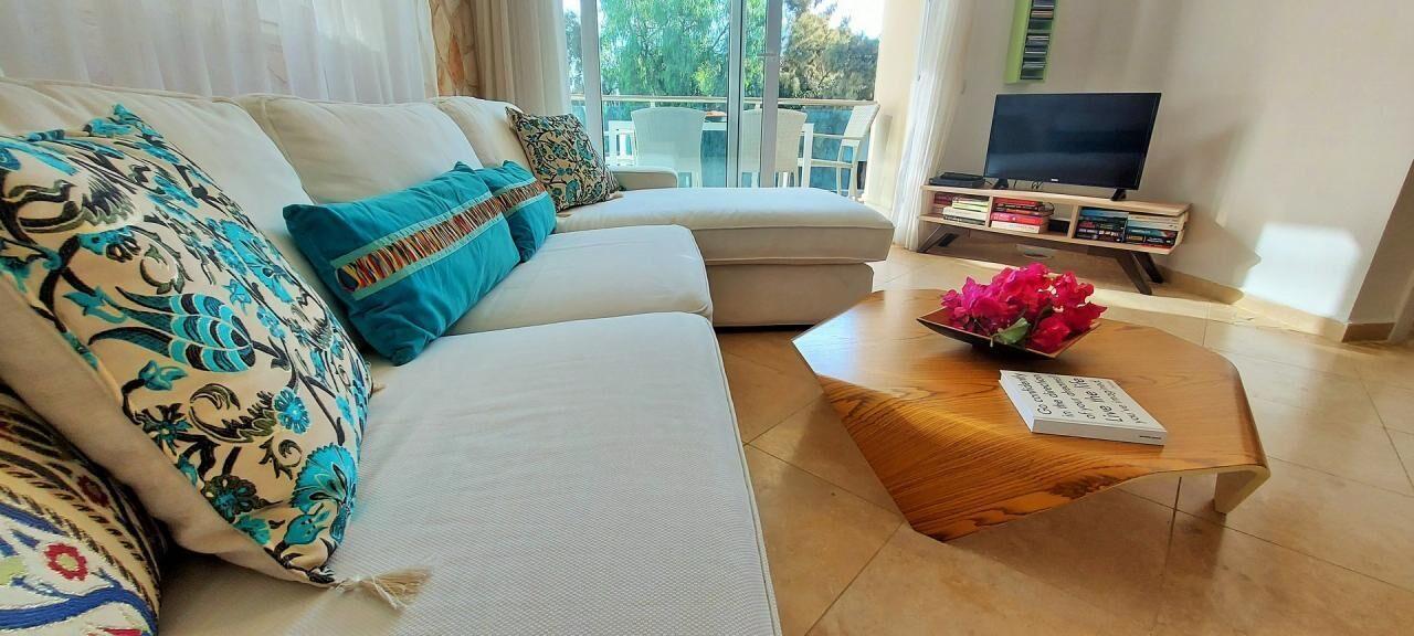 Is an open plan living area with a chaise longue sofa, fully equipped kitchen, and dining table for 6. There is a further dining table on the balcony ideal for sundowners which is accessed through fully glazed patio doors. For your further entertainment, there is a 42 inch LCD TV with English speaking satellite channels, DVD player and iPod & mp3 player sound dock.