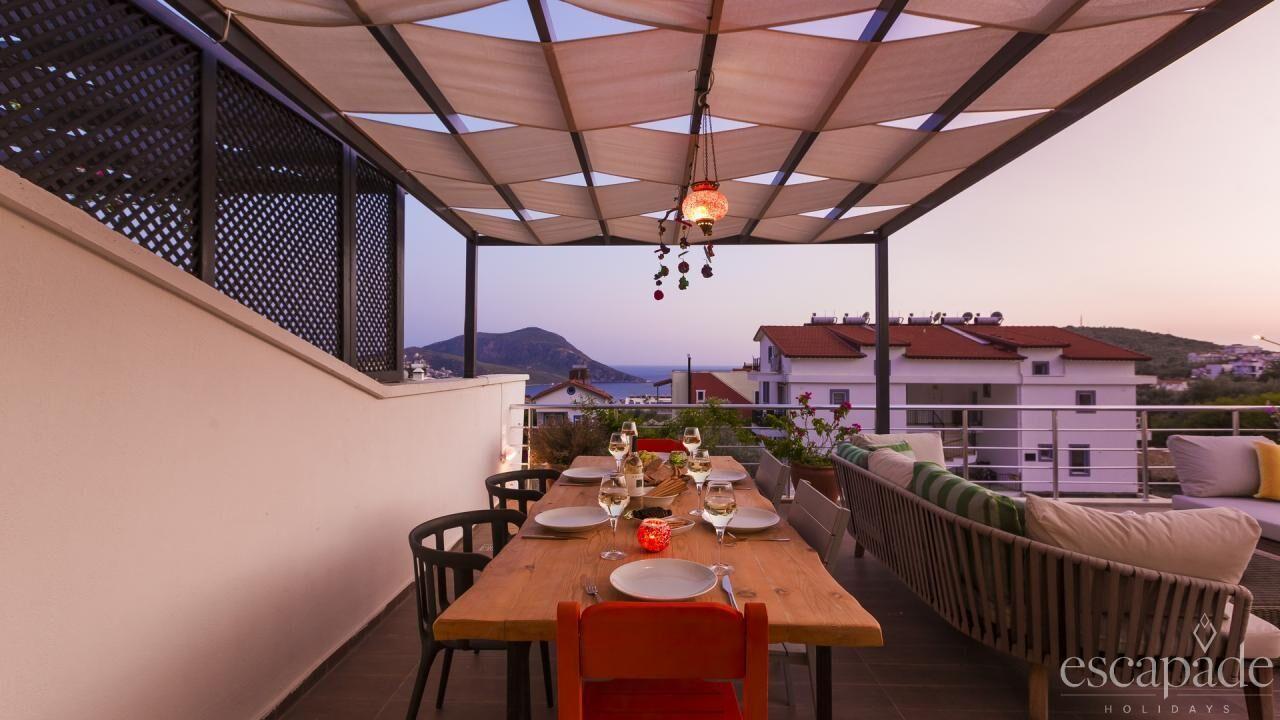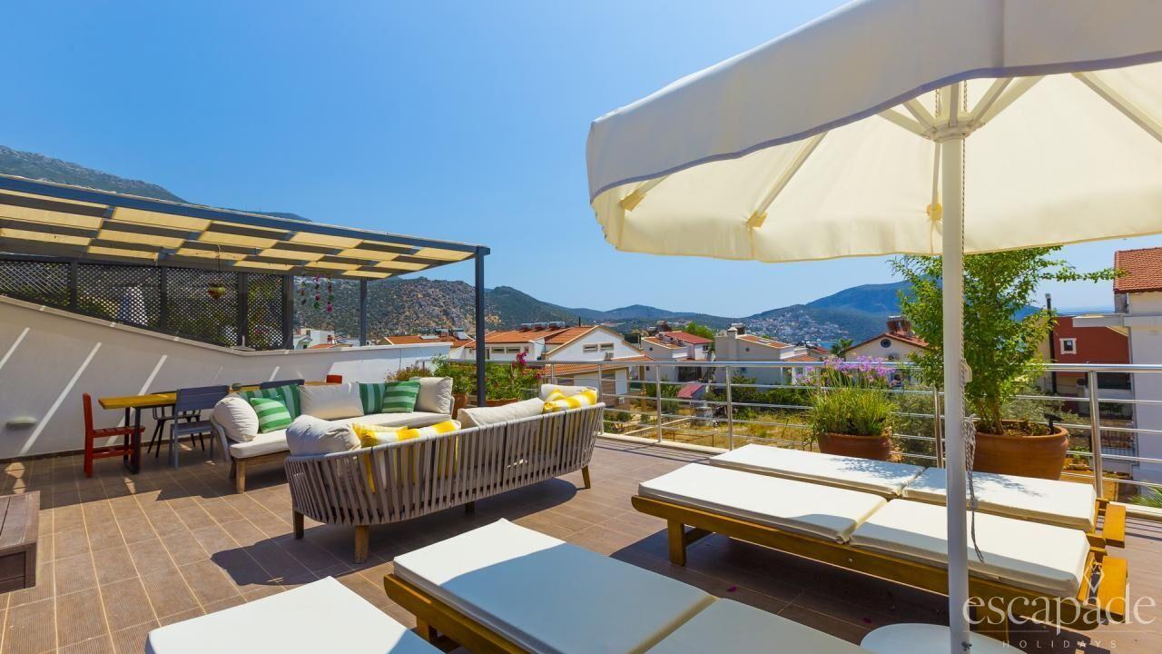 The large open terrace can be accessed from the lounge and via large sliding patio windows from the kitchen and indoor dining area, which leads out to the shaded alfresco dining area and again you can enjoy stunnıng views of Kalkan Bay.