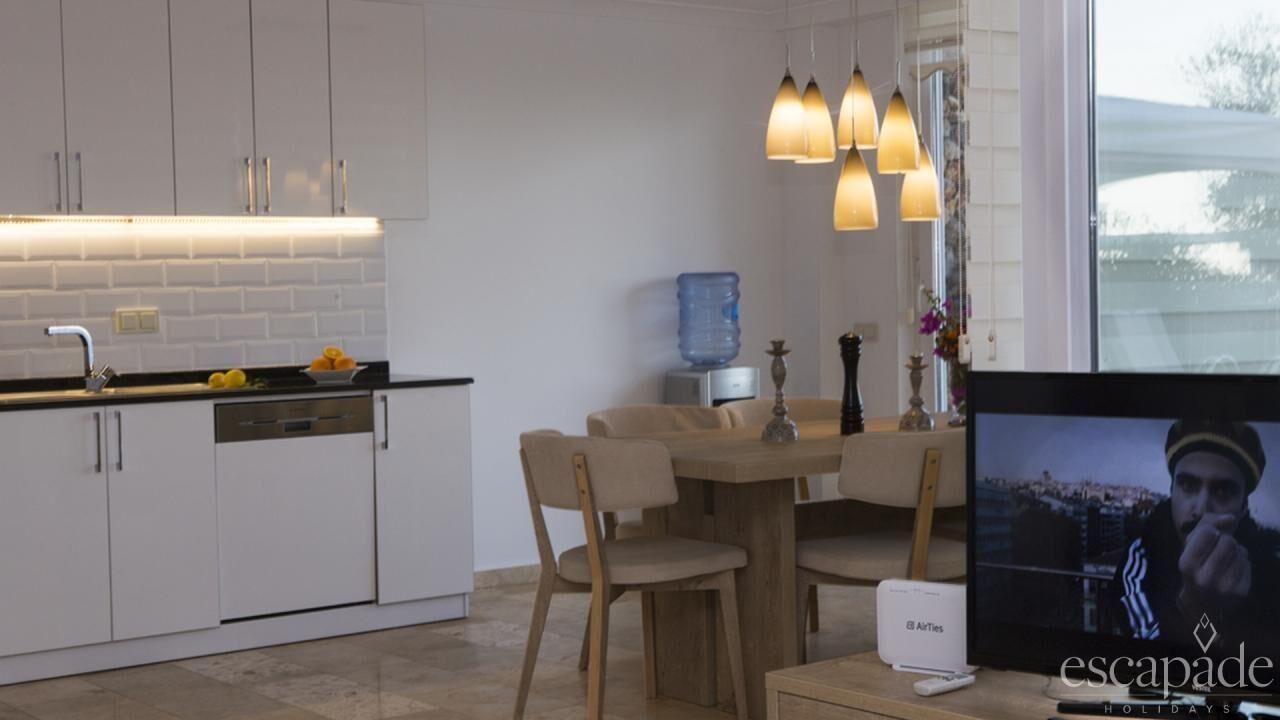 The beautifully appointed and spacious and open plan living area has been finished in a striking contemporary style. There is a large dining table that comfortably and spaciously seats six people and the luxury kitchen has a range of quality appliances, including electric oven, gas hob, fridge-freezer, microwave, dishwasher and cold water dispenser. There is satellite TV, DVD player and Bluetooth speaker system in this living area. Floor to ceiling sliding doors afford stunning views of the bay and mountains and lead directly to the outside pool and terrace.
