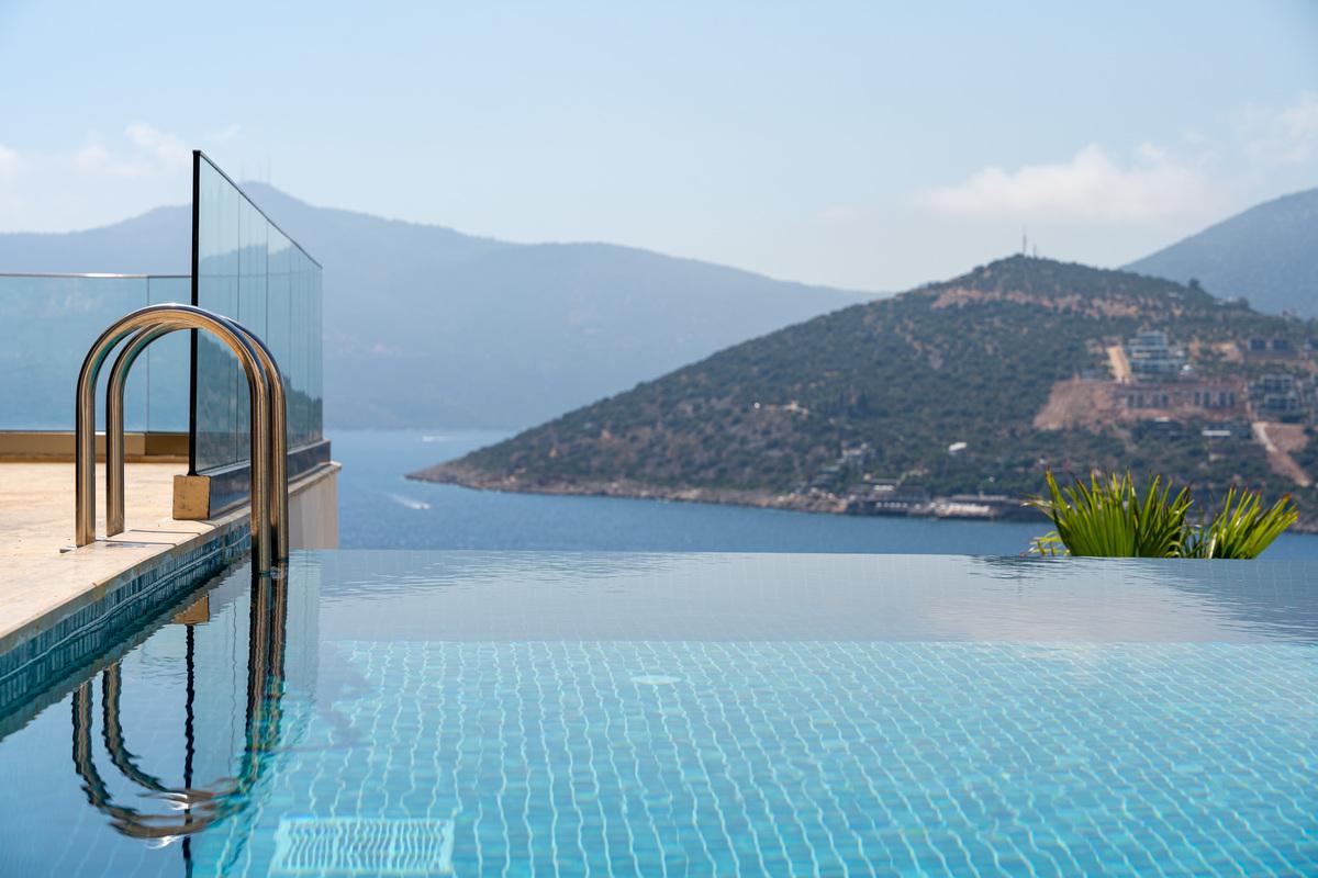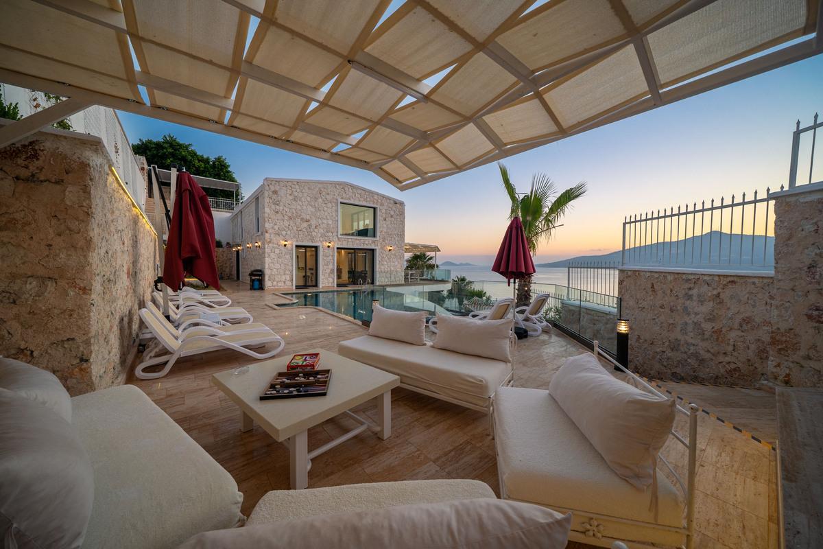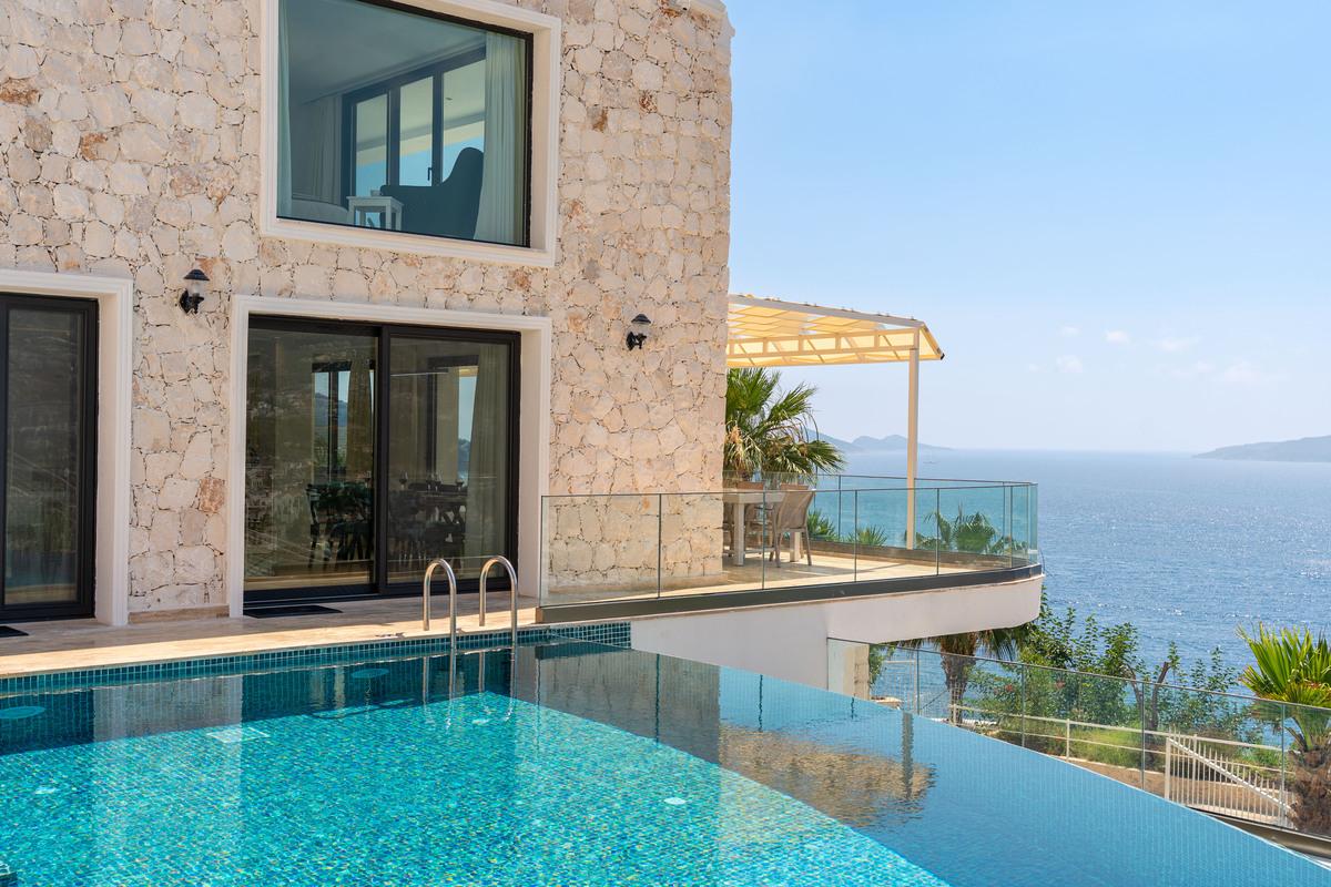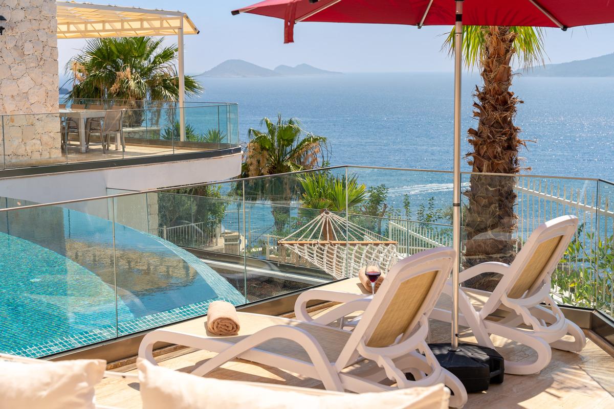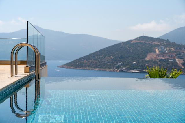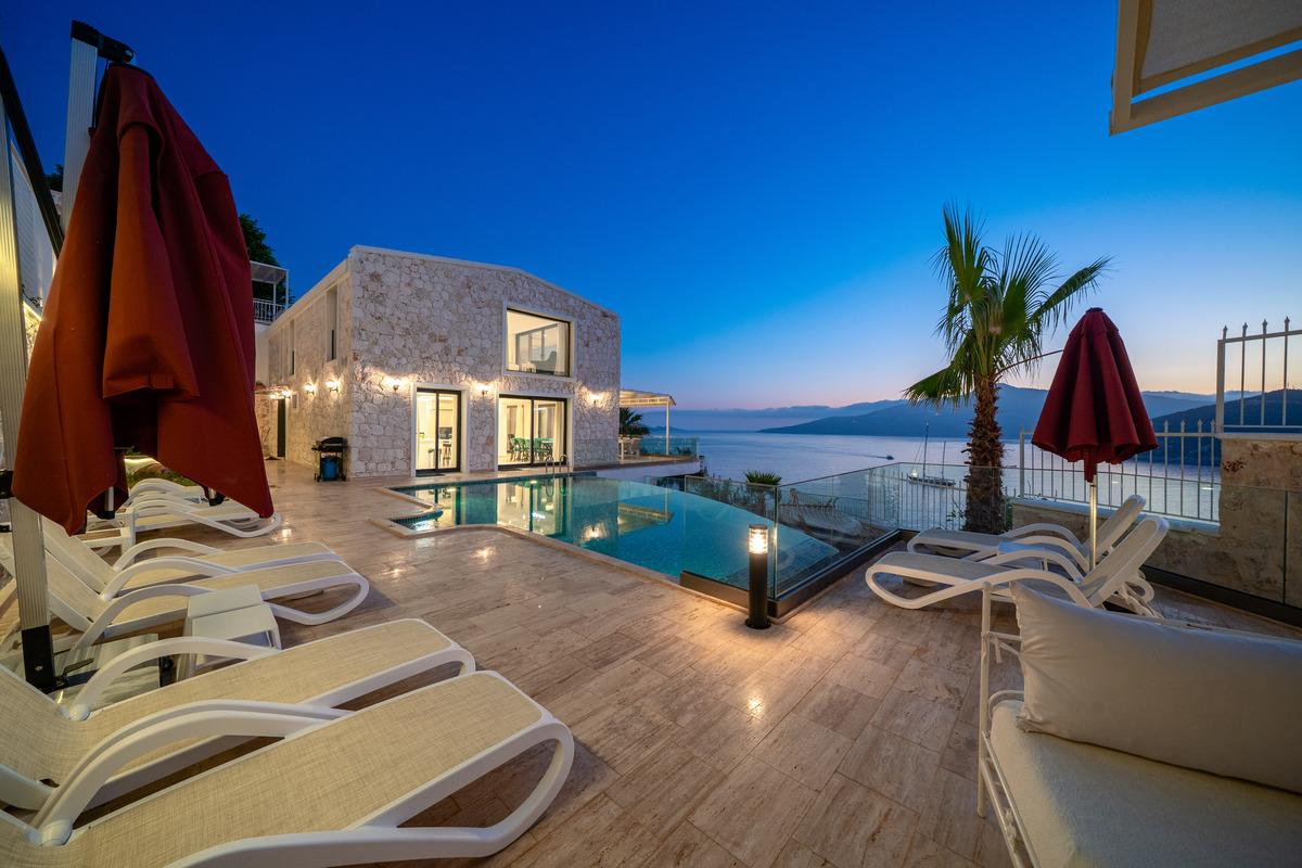 Kalkan’da lüks 5 yatak odalı villa; sonsuzluk havuzu, teraslar, deniz manzarası, en-suite odalar ve merkeze yakın konum.