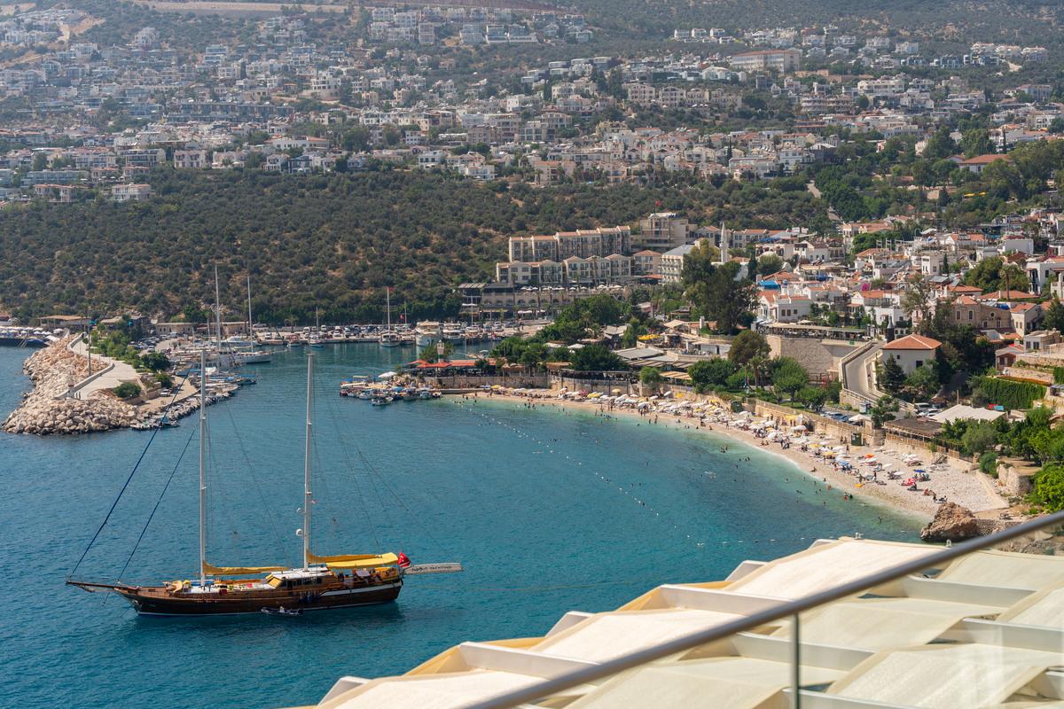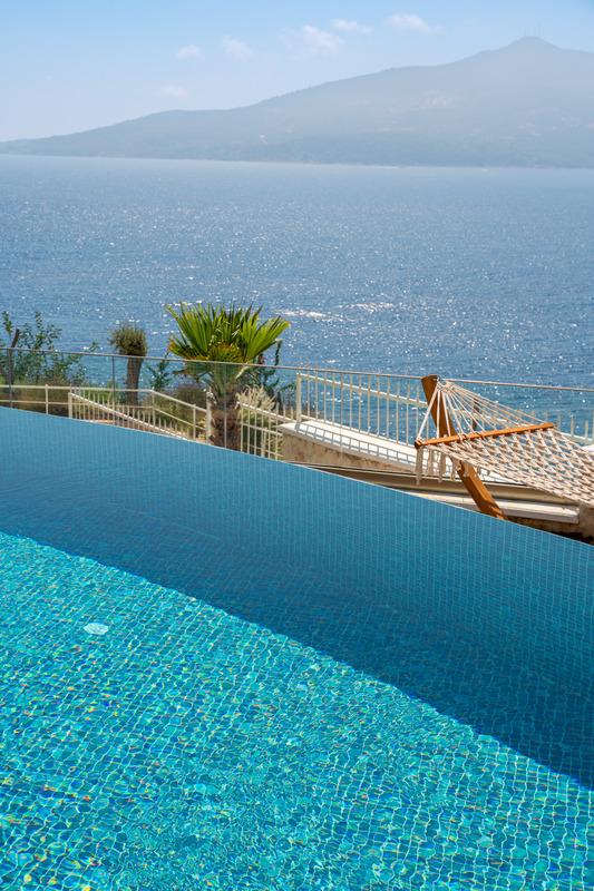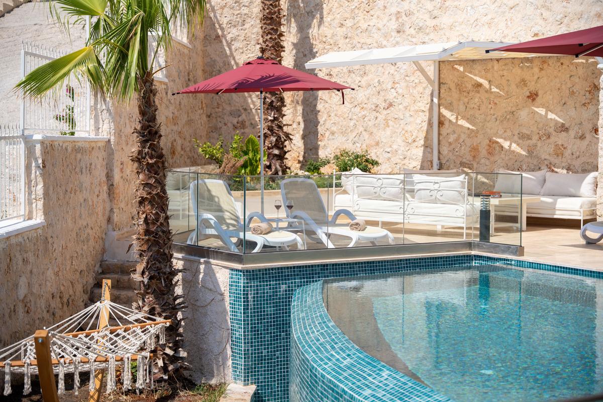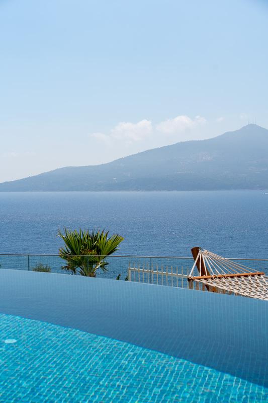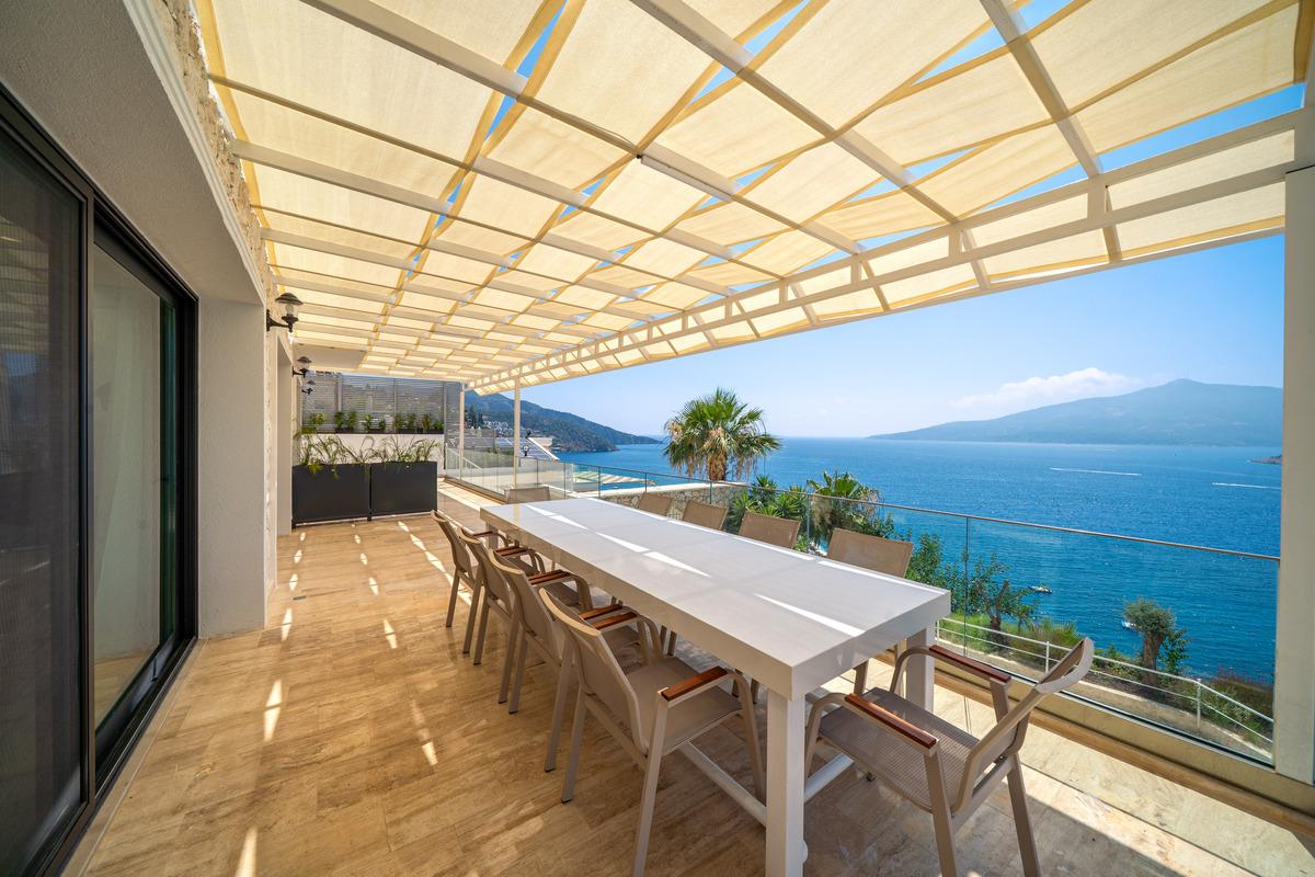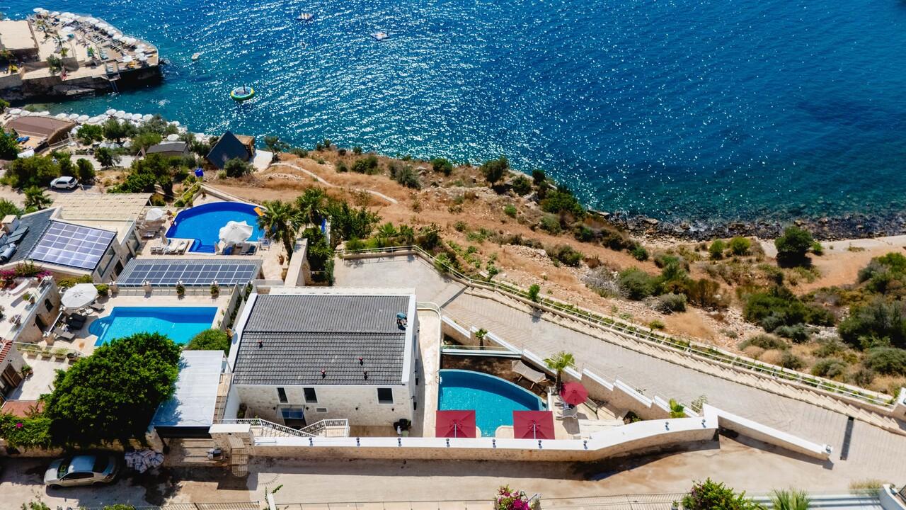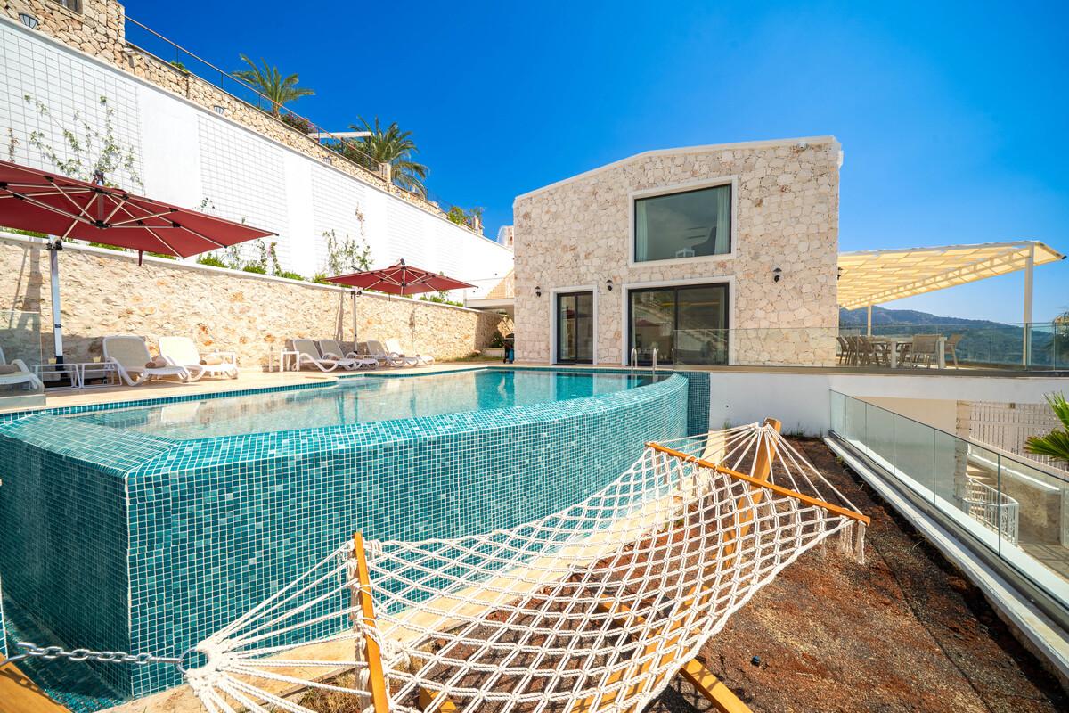 Kalkan’da lüks 5 yatak odalı villa; sonsuzluk havuzu, teraslar, deniz manzarası, en-suite odalar ve merkeze yakın konum.