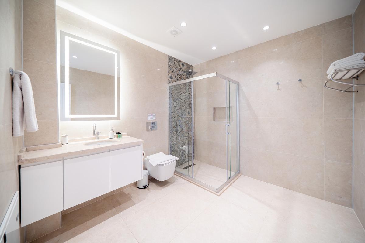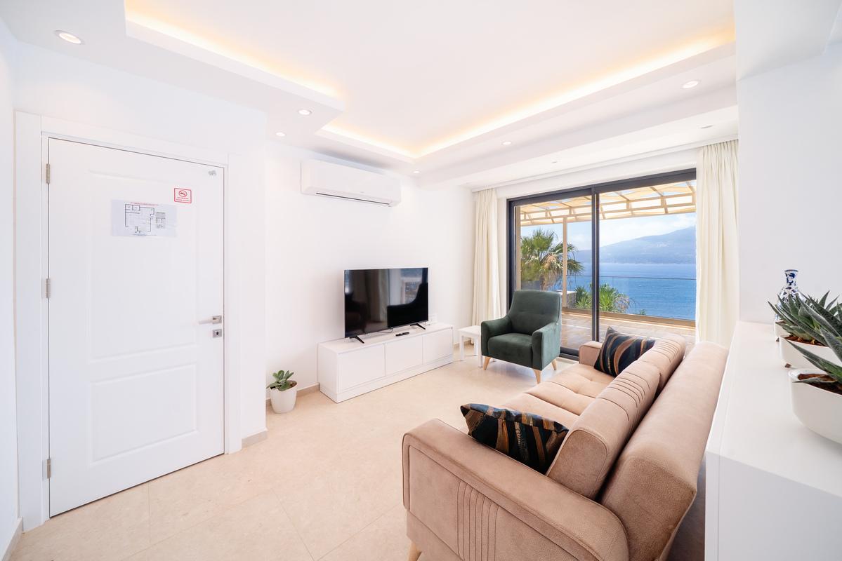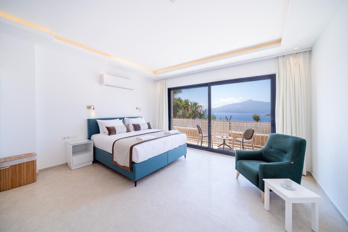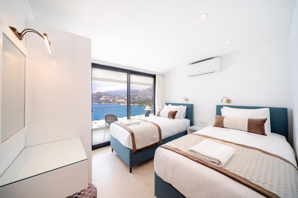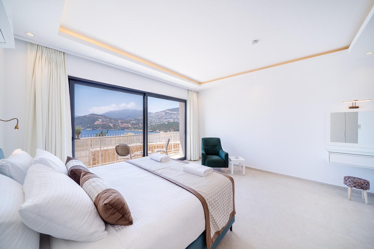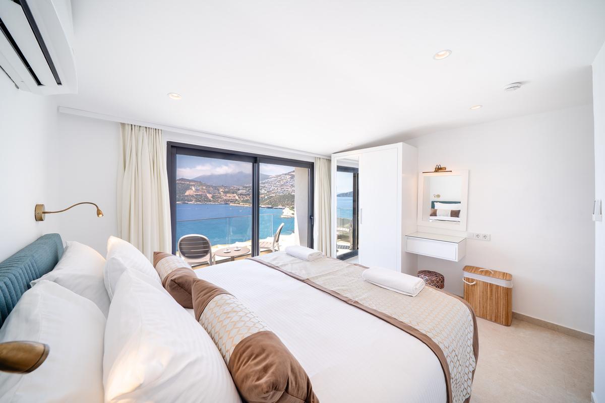 Birinci katta üç yatak odası bulunur: iki king-size yataklı çift kişilik oda ve istenirse çift kişilik olarak kullanılabilen bir ikiz yatak odası. Tüm odalarda en-suite banyo, gardırop, makyaj alanı ve tavandan tabana cam kapılarla açılan paylaşımlı balkon mevcuttur. Her odanın kendi oturma alanı bulunur ve Kalkan Körfezi ile Yılan ve Fare Adaları manzarasının tadını çıkarabilirsiniz. Ana yatak odasında havuza bakan büyük bir pencere ve rahat bir koltuk da mevcuttur.