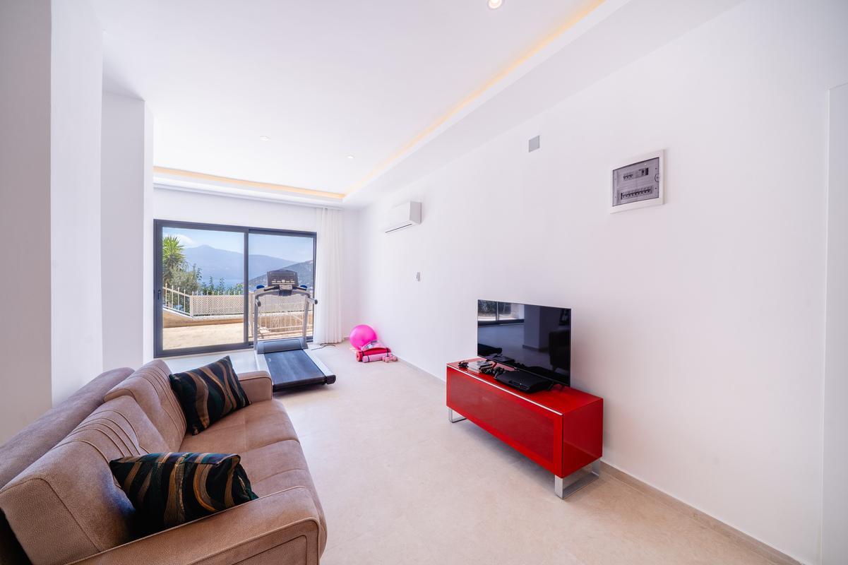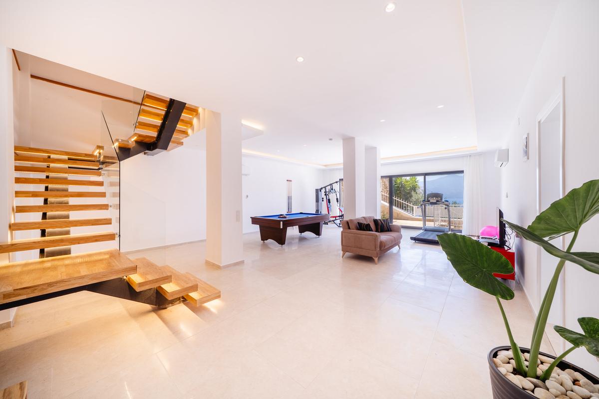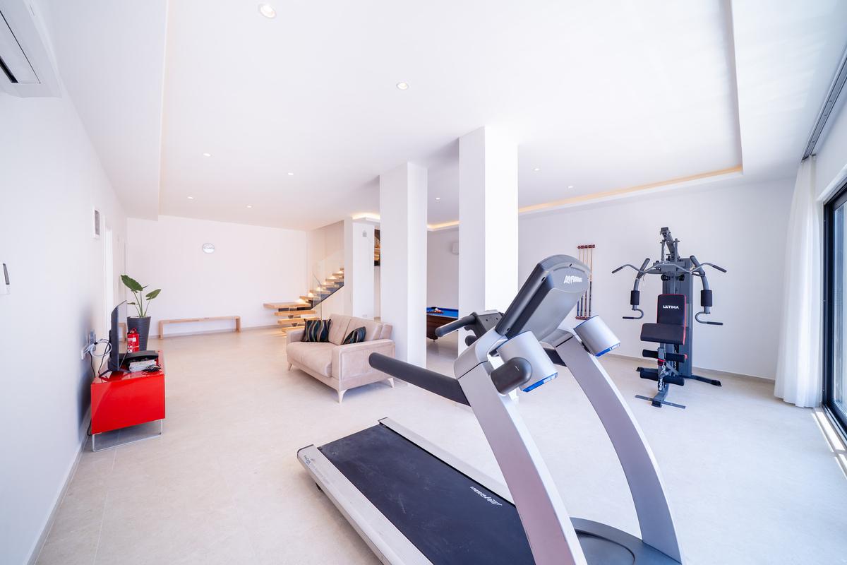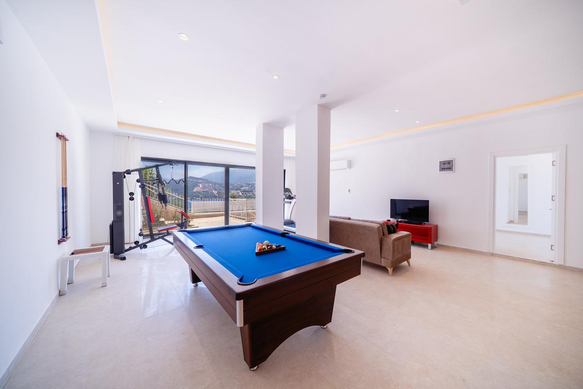 Alt zemin katta villanın son yatak odası bulunur; geniş bir çift kişilik oda olup en-suite banyo ve deniz manzaralı bir avluya açılır. Ayrıca oyun ve gym odası yer alır; burada rahat bir lounge, PlayStation, SMART TV, koşu bandı, multi-gym cihazı ve Amerikan bilardo masası mevcuttur. Bu katta ayrıca bir W/C ve duş alanı da bulunur.