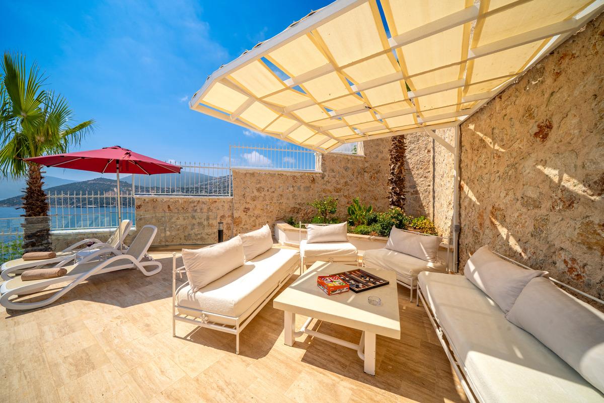 Villa Lalin’in terasları tam anlamıyla rahatlama ve keyif için tasarlanmıştır. Sonsuzluk havuzu, şezlonglar ve güneş şemsiyeleri ile çevrilidir. Gölgeli oturma alanı, yastıklı kanepeler ve büyük bir sehpa ile güneşten korunarak dinlenebileceğiniz bir alan sunar. Pergola ile kaplı açık hava yemek alanı 10 kişilik olup, Kalkan Körfezi manzarası eşliğinde gazlı BBQ ile servis edilir.